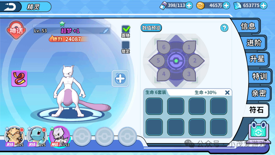 进阶,升星,特训以及亲密度是精灵的附属加成,这些数值培养的越高,对战力的提升就越高