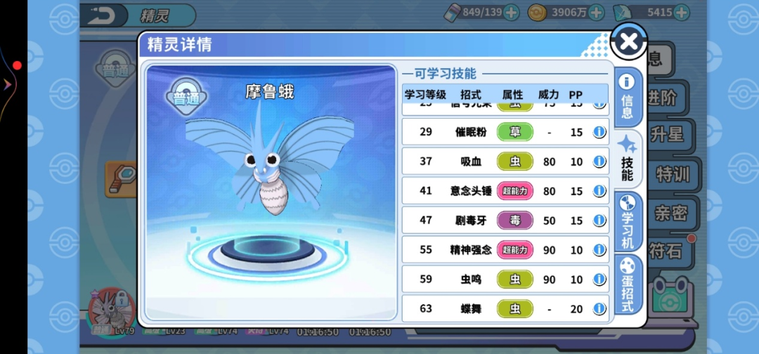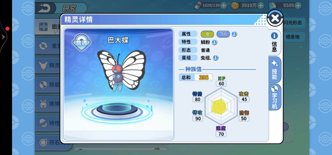 摩鲁蛾它也可以学会催眠粉 ,还有蝶舞这个神技 ,再看一下巴大蝶的种族值